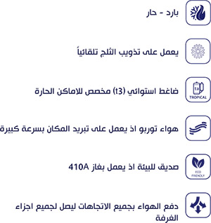 " هواء توربو اذ يعمل على تبريد المكان بسرعة كبيرة - صديق للبيئة اذ يعمل بغاز 410A (t3) - ضاغط استوائي مخصص الى الاماكن الحارة - بارد - حار - يعمل على تذويب الثلج تلقائياً - دفع الهواء بجميع الاتجاهات ليصل لجميع اجزاء الغرفة"